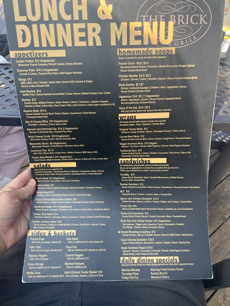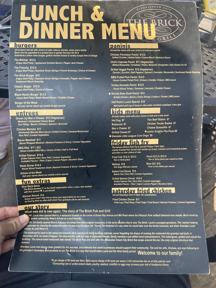 Introducing the menu at The Brick Pub & Grill, a modern pub in Glendale, WI, specializing in American cuisine. This laid-back establishment offers a diverse menu with many vegetarian options and a full bar featuring happy hour specials. Customers rave about the delicious food, friendly service, and inviting ambiance. Highlights include the Gyro, chicken Club, Bloody Marys, and eggs Benedict with perfectly made hollandaise sauce. The outdoor seating area is pet-friendly, making it a great spot to dine with your furry friends. The restaurant also offers live music, pool tables, and private dining options. Whether you're in the mood for a casual dinner or a fun night out with friends, The Brick Pub & Grill is the place to be. Experience their flavorful dishes, attentive staff, and relaxed atmosphere for a memorable dining experience. Visit them at 6343 N Green Bay Ave or call (414) 797-0710 for reservations.